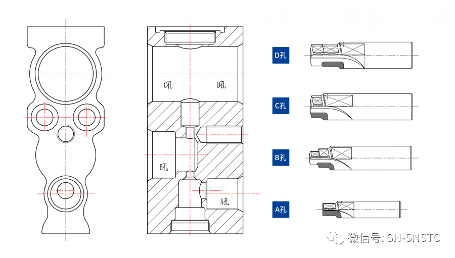 汽車空調(diào)系統(tǒng)誕生于上世紀(jì)20年代,發(fā)展至今已有近百年歷史,汽車空調(diào)如今已成為汽車標(biāo)配之一。汽車空調(diào)膨脹閥是汽車空調(diào)制冷系統(tǒng)中一個(gè)重要的部件,閥體上有ABCD四個(gè)孔,以往加工這些孔都是采用硬質(zhì)合金刀具。隨著市場(chǎng)競(jìng)爭(zhēng)愈發(fā)激烈,硬質(zhì)合金刀具的劣勢(shì)開(kāi)始凸顯:孔壁粗糙度不佳,刀具使用壽命不高等。