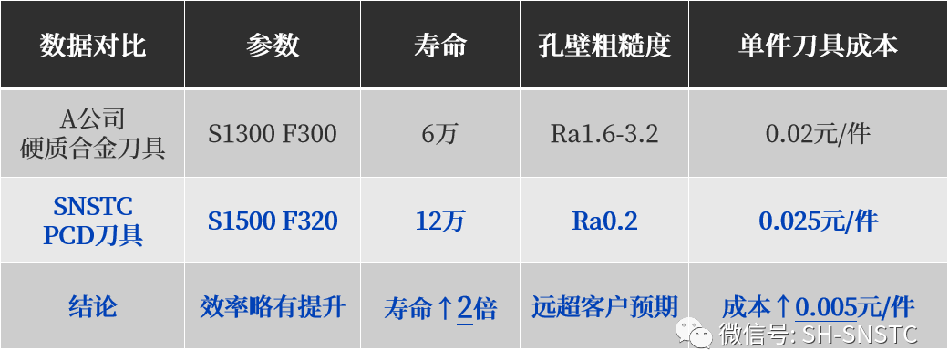 通過(guò)客戶加工實(shí)測(cè),我司開(kāi)發(fā)的PCD刀具在客戶關(guān)鍵、迫切的粗糙度要求上,遠(yuǎn)超客戶預(yù)期,穩(wěn)定在Ra0.2,刀具壽命平均提升2倍以上,而刀具成本僅略微上升。對(duì)于我司開(kāi)發(fā)的該類型PCD刀具,客戶均給予極大肯定!