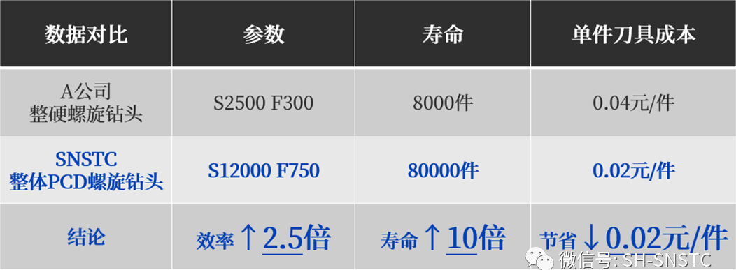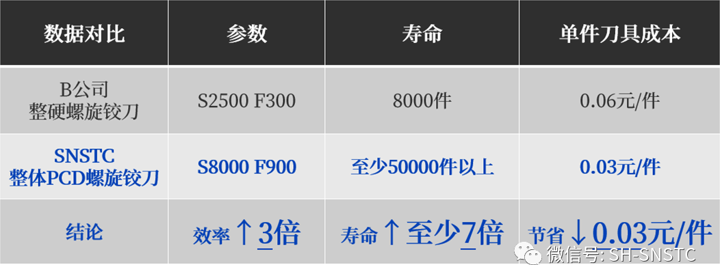 通過(guò)客戶實(shí)測(cè)加工,我司整體PCD螺旋鉸刀已陸續(xù)使用3個(gè)多月,目前刀具刃口仍完好,加工效率提升3倍,壽命至少提升7倍,單孔加工刀具成本下降50%以上,不僅完全滿足了客戶增效提速的要求,同時(shí)還顯著降低了刀具成本,一舉多得!